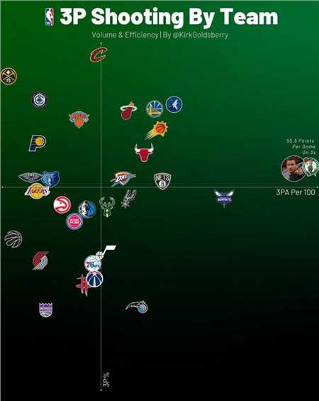 北京时间11月15日:知名数据专家kirk goldsberry于ins平台分享了一张详尽的象限图,该图生动展现了本赛季各球队在每百回合中的三分出手次数及命中率情况。图中数据一目了然,凯尔特人队在三分出手次数上独占鳌头,傲视群雄;而命中率方面,骑士队则以精准著称,领跑全联盟。尤为值得一提的是,森林狼、勇士与太阳三支队伍,在保持高出手次数的同时,命中率也颇为可观,实现了量与质的双重飞跃。