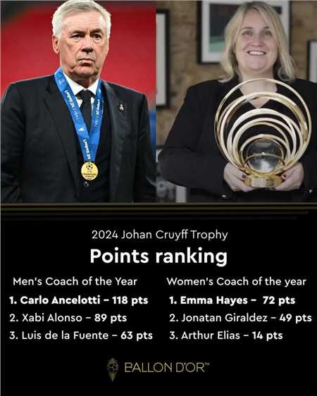 11月9日,金球奖官方公布了2024年最佳教练奖的投票得分情况,其中安切洛蒂获得了118分,哈维-阿隆索获得了89分,德拉富恩特63分。