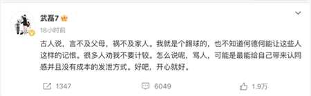 昨日,武磊也是亲自发文,回应申花球迷的辱骂,武磊说道:“言不及父母,祸不及家人。我就是个踢球的,也不知道何德何能让这些人这样的记恨。很多人劝我不要计较。怎么说呢,骂人,可能是最能给自己带来认同感并且没有成本的发泄方式。好吧,开心就好。”