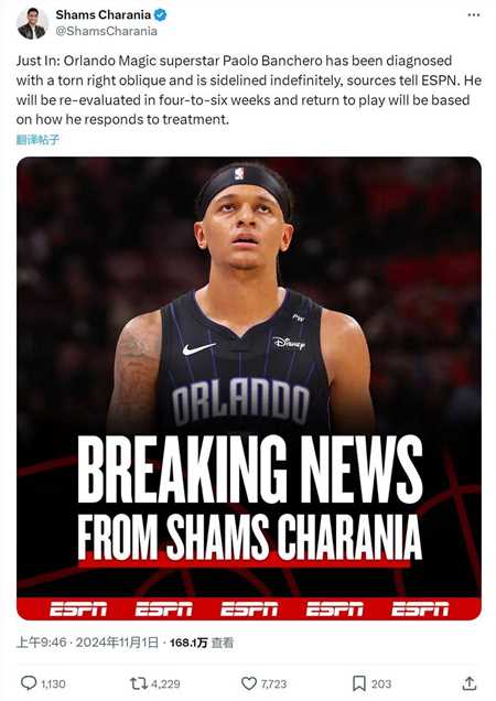 北京时间11月1日上午,nba名记shams报道,魔术球星班凯罗遭遇右斜肌撕裂,他将在4至6周后重新评估。这个消息很突然,班凯罗最近势头正盛,过去两场比赛,他一共拿到81分20篮板13助攻,打出了mvp级别的数据!